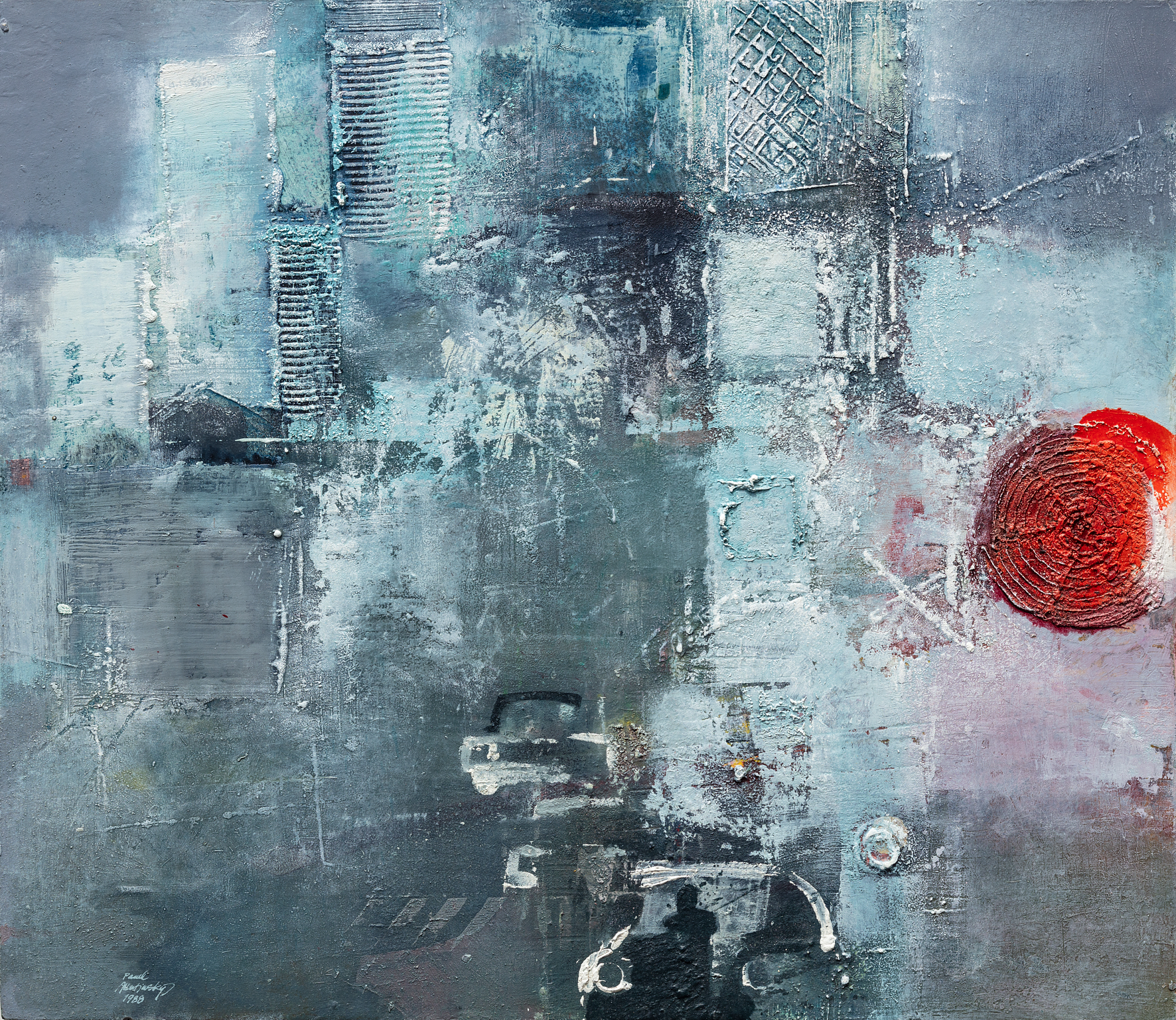 Malby Město s červeným signálem Autor Pavel Mutinský 1988 Formát 65 x 75 cm Technika email, olej, sololit Další díla autora